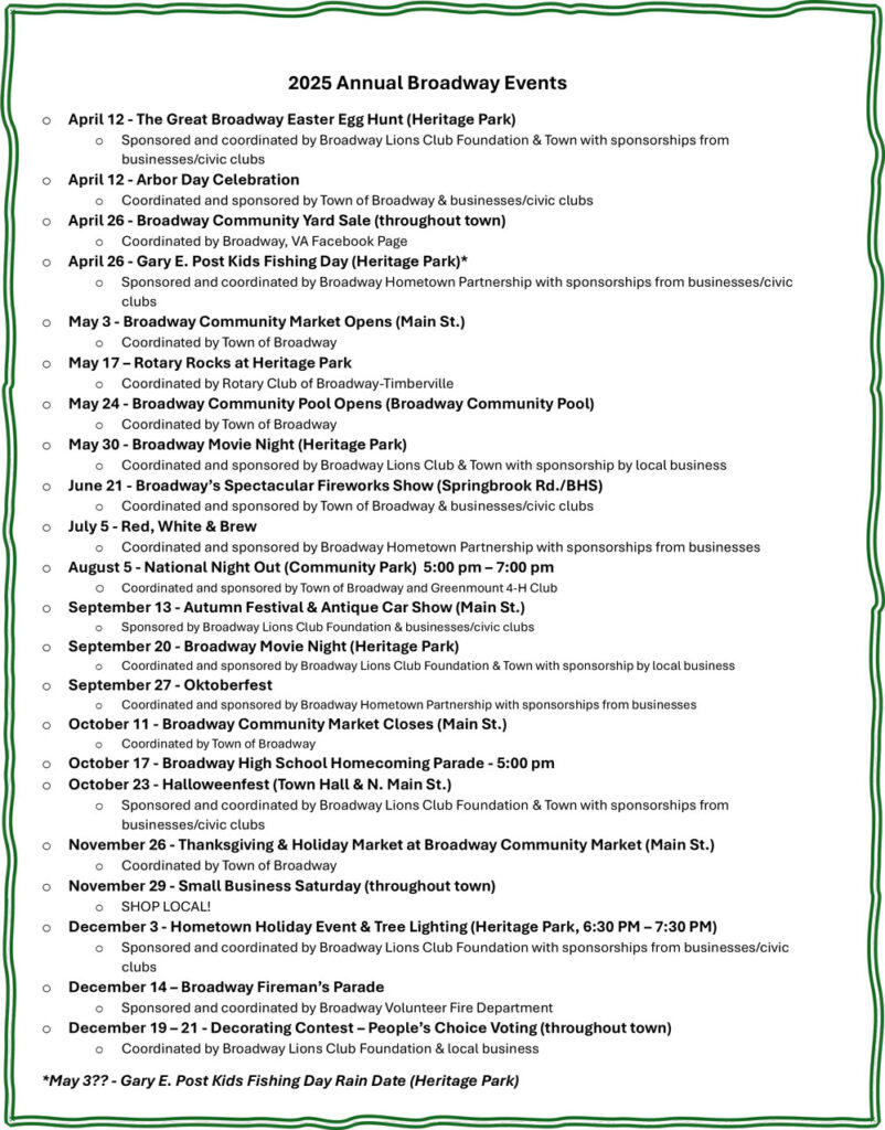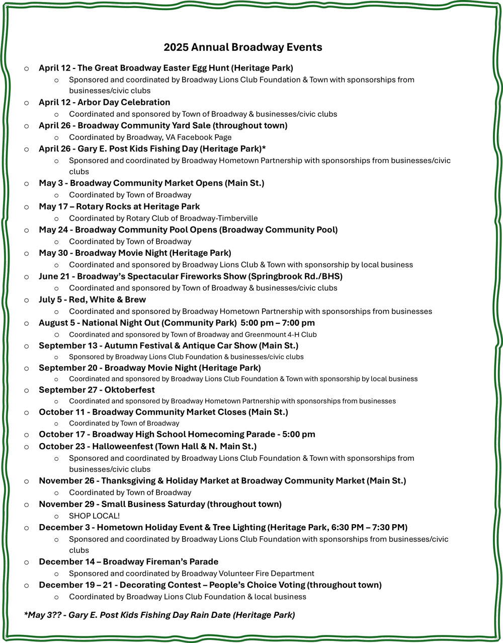 TOWN OF BROADWAY Planning Commission Meeting/Joint Public Hearing with Town Council 10-21-25 The Broadway Planning Commission will meet on Tuesday, October 21, 2025, at 7:00 p.m. in the Council Chambers